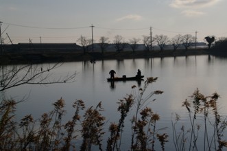 / 人,船,帽子,川,植物,魚,建物,堤防,電柱,看板