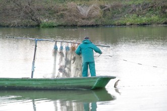 / 人,船,川,帽子,網,魚,かご,手袋
