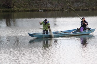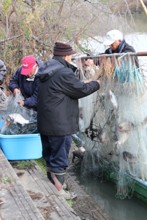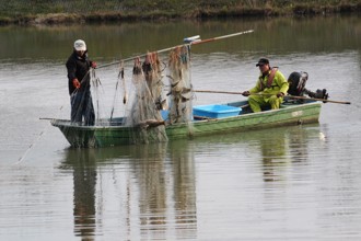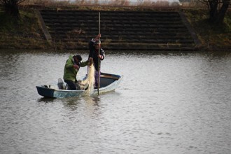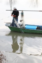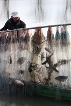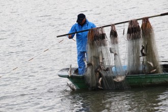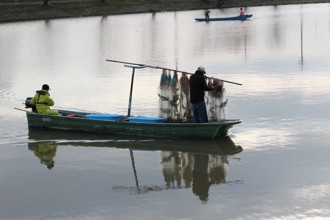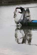 / 人,魚,網,帽子,川,船