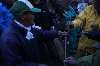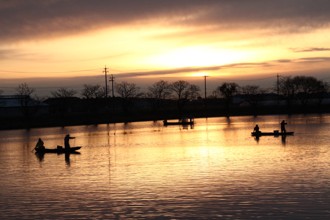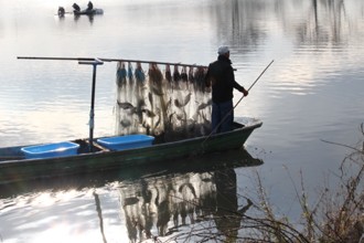 / 人,魚,川,網,船,帽子,植物,かご