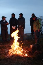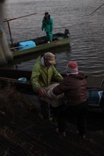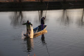 / 人,魚,帽子,網,川,船,かご,植物,河畔植生