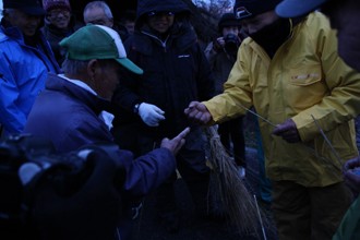 / 人,川,帽子,網,魚,船,かご,手袋,植物