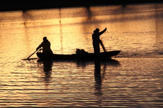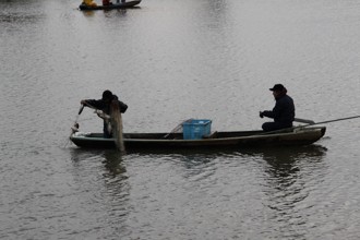 / 人,川,船,魚,網,帽子,植物