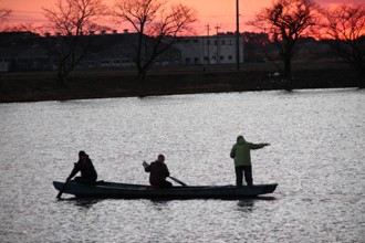 / 人,船,川,網,魚,木,植物,電柱,帽子,建物,かご