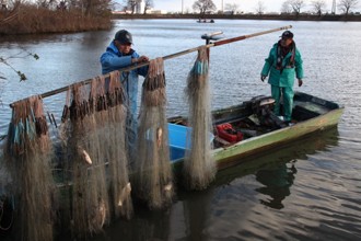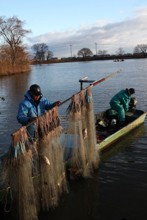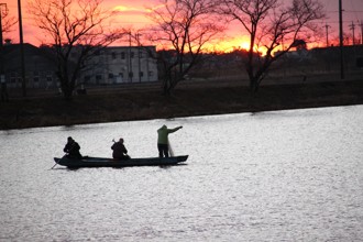 / 人,船,川,網,魚,木,植物,帽子,かご,建物