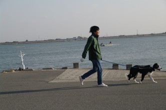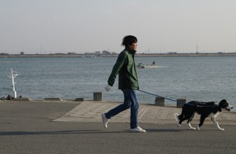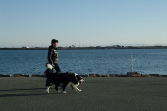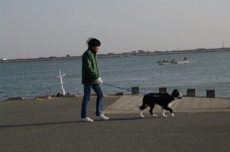 / 人,犬,川,帽子,建物,鉄塔,電柱,空,鳥,植物,手袋,山