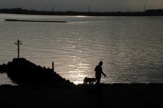 / 人,川,犬,船,建物,鉄塔,空,手袋