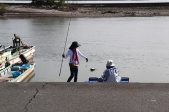 / 人,船,川,帽子,植物,河畔植生,手袋,椅子,釣り竿