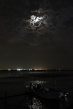 / 川,空,月,夜,船,橋,消波ブロック,建物