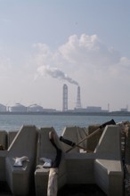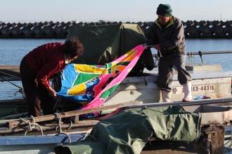 / 人,船,消波ブロック,長靴,帽子,建物,空