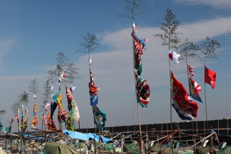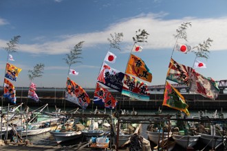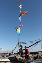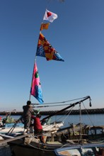 / 人,船,長靴,消波ブロック,植物,旗,帽子,かご,空