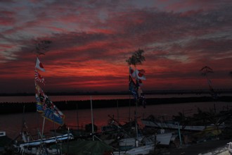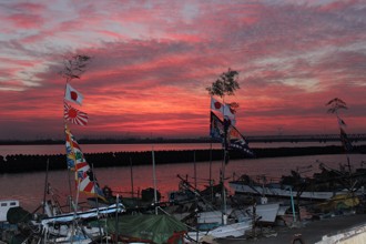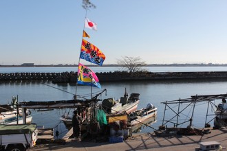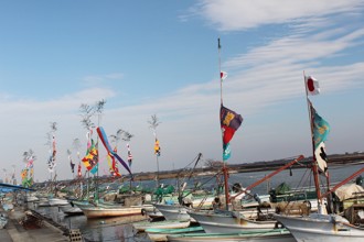 / 人,船,旗,空,木,植物,車,建物,消波ブロック,橋,鉄塔,長靴,帽子,かご