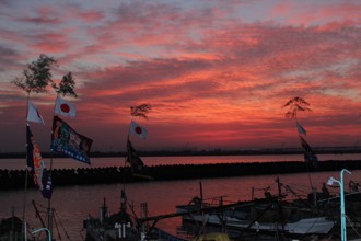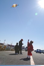 / 人,空,橋,太陽,車,子供,凧,船,植物,旗,帽子,和服,川