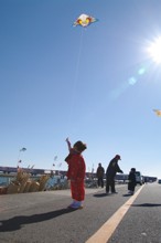 / 人,川,橋,子供,空,車,旗,植物,帽子,犬,手袋,凧,太陽
