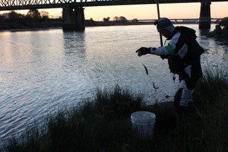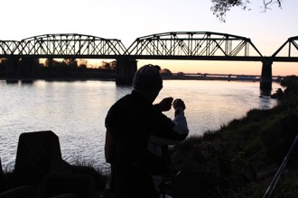 / 人,川,バケツ,帽子,釣り竿,堤防,木,植物,山,河畔植生,手袋,橋,魚,空