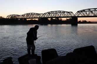 / 人,橋,木,植物,河畔植生,川,空,帽子,バケツ,釣り竿,手袋,魚,建物