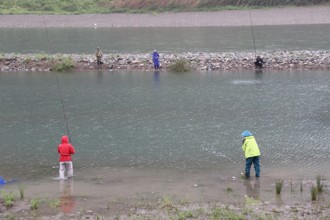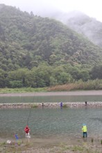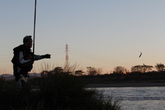 / 人,木,植物,河畔植生,川,空,帽子,釣り竿,魚,山,鉄塔