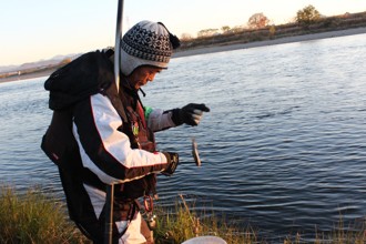 / 人,川,帽子,釣り竿,植物,河畔植生,手袋,長靴,岩石,バケツ