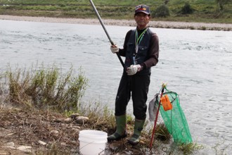 / 人,川,植物,河畔植生,木,手袋,長靴,山,岩石,鳥,電柱,網
