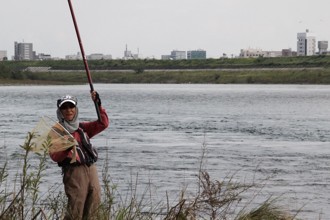 / 人,川,帽子,釣り竿,植物,河畔植生,手袋,堤防,建物