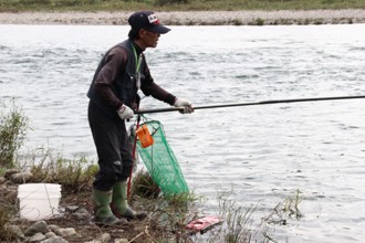 / 川,人,長靴,網,岩石,帽子,釣り竿,魚