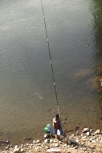 / 人,川,帽子,釣り竿,植物,河畔植生,手袋,長靴,網,岩石
