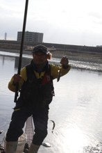 / 人,帽子,長靴,川,堤防,橋,建物,空,岩石,腕時計,クーラーボックス