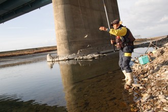 / 人,川,帽子,釣り竿,木,植物,河畔植生,手袋,橋,空,長靴