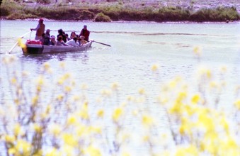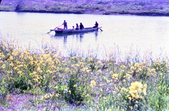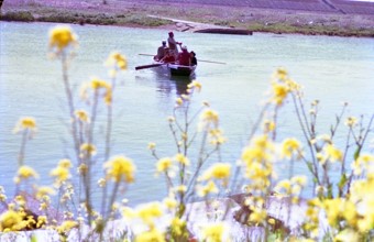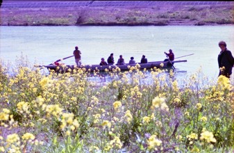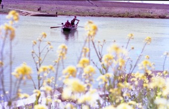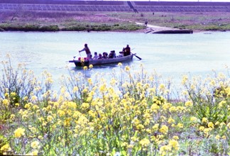 菜の花と小紅の渡し岐阜市一日市場 / 船,人,花,植物,子供,帽子,川,堤防,河畔植生
