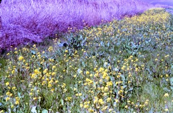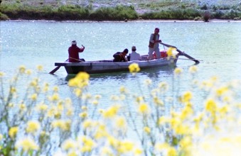 菜の花と小紅の渡し岐阜市一日市場 / 人,船,植物,花,川,帽子,河畔植生