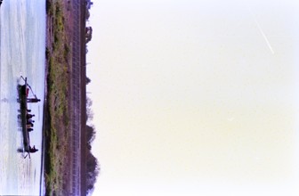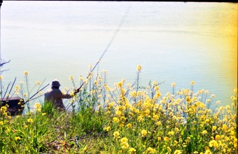 / 人,帽子,釣り竿,植物,花,堤防,河畔植生