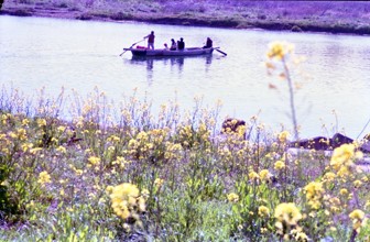 / 船,人,植物,花,川,堤防,帽子,眼鏡,河畔植生