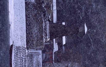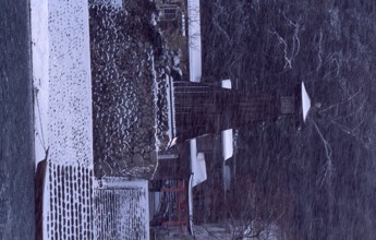 / 雪,神社,舟,川,植物,建物,階段,冬,鳥居,石垣
