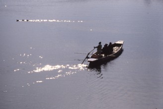 詩情誘う渡し舟 / 人,舟,川,鳥,帽子
