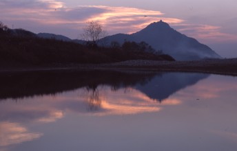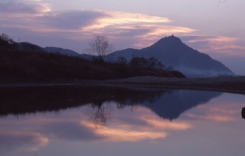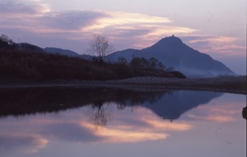 ワンドに映える金華山 / 金華山,山,植物,鉄塔,水面,太陽,岩石
