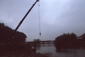 / 川,重機,植物,河畔植生,クレーン,橋,岩石,空