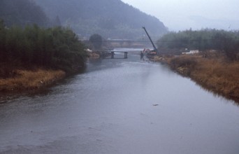 / 川,重機,植物,河畔植生,クレーン,橋,岩石,空,車,山