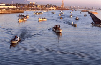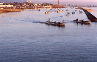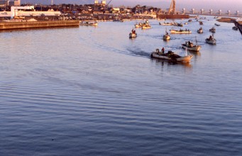 漁船一斉出航 / 川,舟,漁船,建物,人,車,重機,植物,街灯,電柱,橋,山