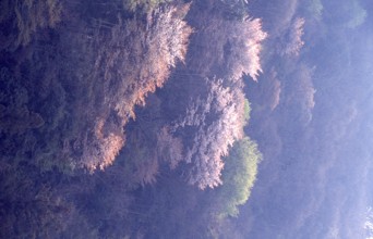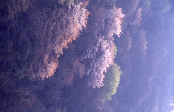 / 桜,川,河畔植生,山,建物,ガードレール,岩石,タンポポ,鉄塔