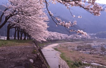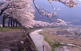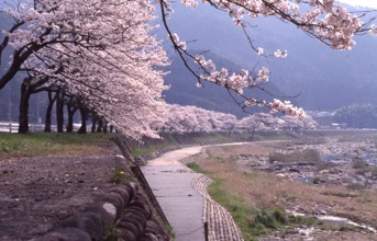 桜堤 / 桜,川,河畔植生,山,建物,車,ガードレール,岩石,タンポポ,鉄塔