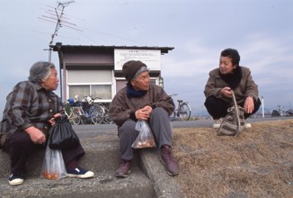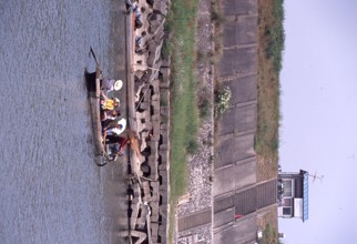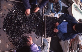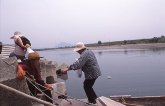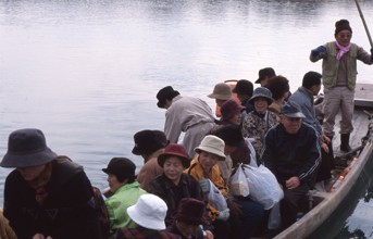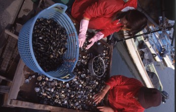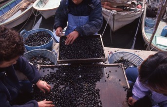しじみ漁選別作業 / 貝,人,舟,しじみ,籠