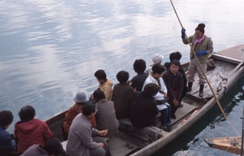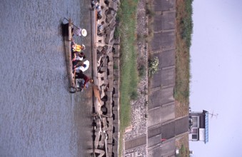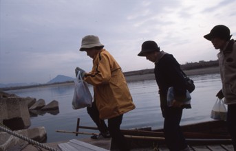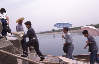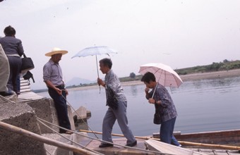 小紅の渡し風景 / 舟,川,傘,建物,河畔植生,階段,人,帽子,自転車
