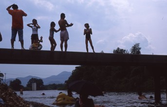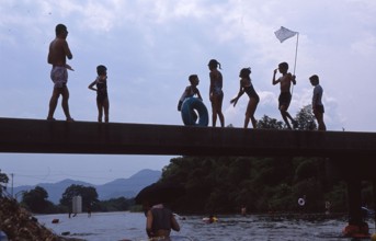 / 人,子供,水着,橋,網,山,植物,木,浮き輪,川,空,電柱,河畔植生