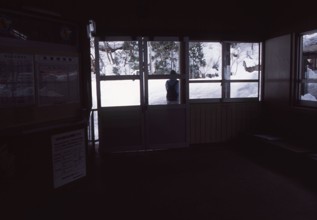 / 扉,雪,人,帽子,駅舎,時刻表,冬