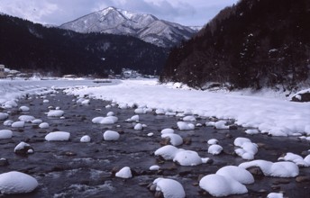 春遠からじ / 山,雪,木,植物,建物,岩石,空,川,冬