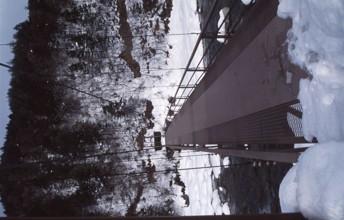 / 橋,吊り橋,山,木,植物,雪,冬,空,川