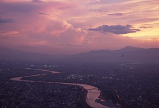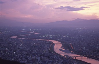 長良川夕景 / 夕焼け,雲,町,山,橋,空,川