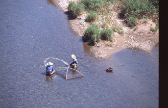/ 人,帽子,笠,胴長,バケツ,植物,漁,網,川,河畔植生,岩石