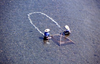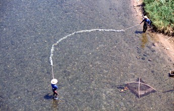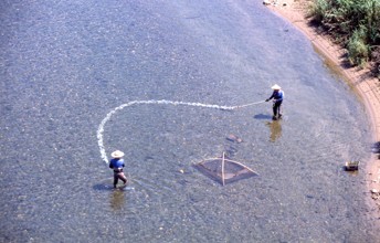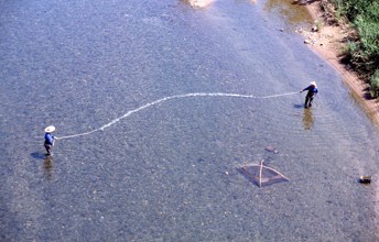 / 人,帽子,笠,胴長,漁,網,川,岩石