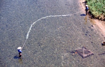 いしこ引き漁=がら引き漁 / 人,帽子,笠,胴長,バケツ,植物,漁,網,川,河畔植生,岩石